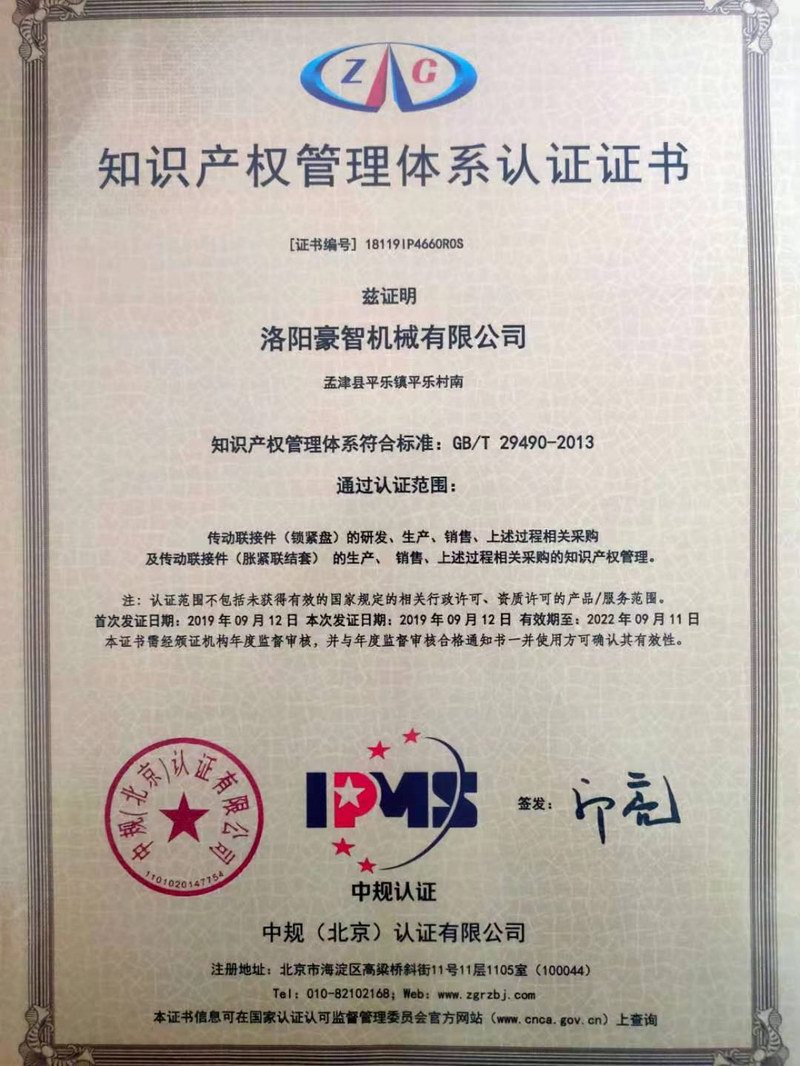 2019年9月12日洛陽豪智機(jī)械有限公司按照國家標(biāo)準(zhǔn)的要求建立或完善知識(shí)產(chǎn)權(quán)管理體系,通過中規(guī)(北京)認(rèn)證有限公司的評審,獲得認(rèn)證,取得了知識(shí)產(chǎn)權(quán)管理體系認(rèn)證證書,來提升企業(yè)知識(shí)產(chǎn)權(quán)的管理及運(yùn)用水平,增強(qiáng)企業(yè)的核心競爭力。