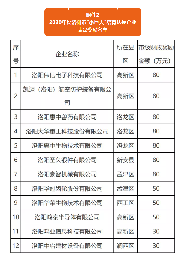 洛陽(yáng)市人民政府關(guān)于表彰獎(jiǎng)勵(lì)2020年度洛陽(yáng)市小巨人培育達(dá)標(biāo)企業(yè)的通報(bào)